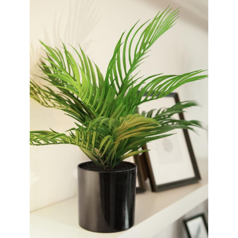 Menší okrasná umělá pokojová palma Areca v plastovém černém květináči- krásná bytová dekorace do nejrůznějších interiérů. Výška 46 cm (včetně květináče).
